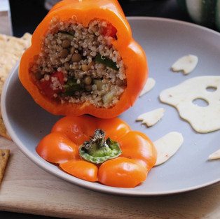 Orange bell peppers make for great pumpkin look-alikes. Plus -- they are easy to carve! I stuffed mine with this Copycat Costco Quinoa Salad to look like pumpkin “guts” were coming out. Half of the fun of Halloween food is just about getting creative with the names. Kids probably won’t gravitate to quinoa and lentils, but “pumpkin guts”? Sure thing! The trick is to make it exotic and enticing, something different than the everyday.